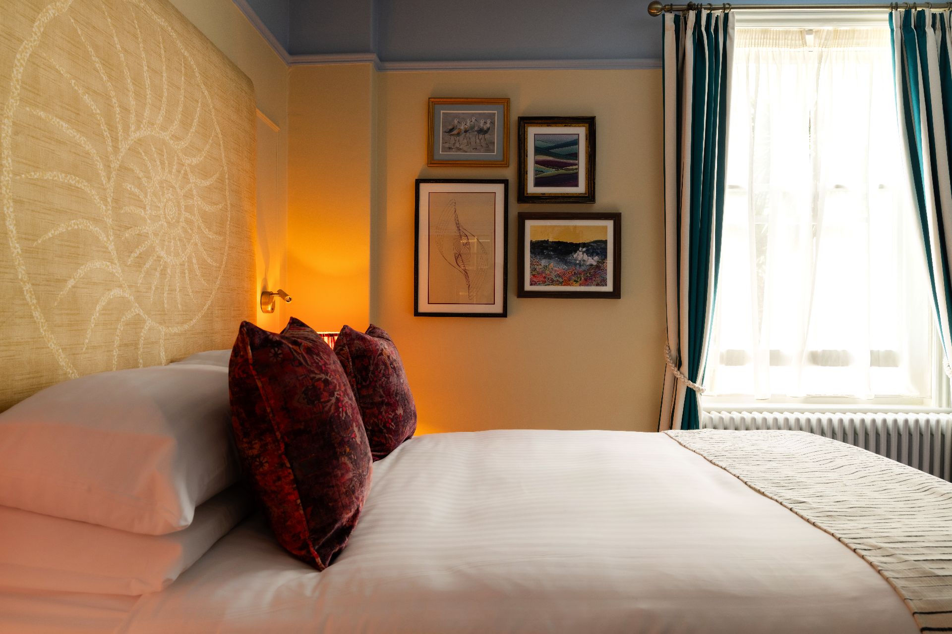 Our Master Double rooms offer stylish and spacious accommodation in Bridport, they all feature glamorous signature wallpapers, deluxe king-size beds, Smart TVs, white black-out blinds, fine Egyptian cotton linen, robes, Artisan Coffee Co coffee, and Bramley toiletries in luxury en suite bathrooms.